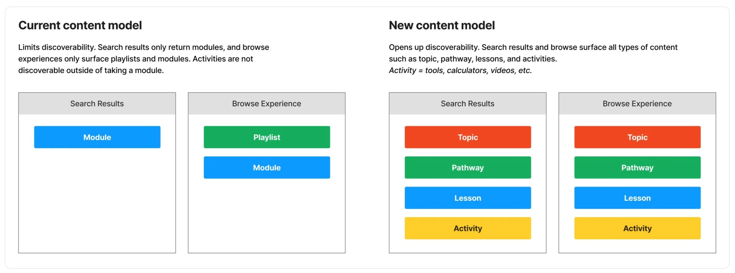 By breaking content apart into smaller pieces, we improve discoverability and relevancy of specific types of content experiences that serve people no matter where they are in their financial education journey,