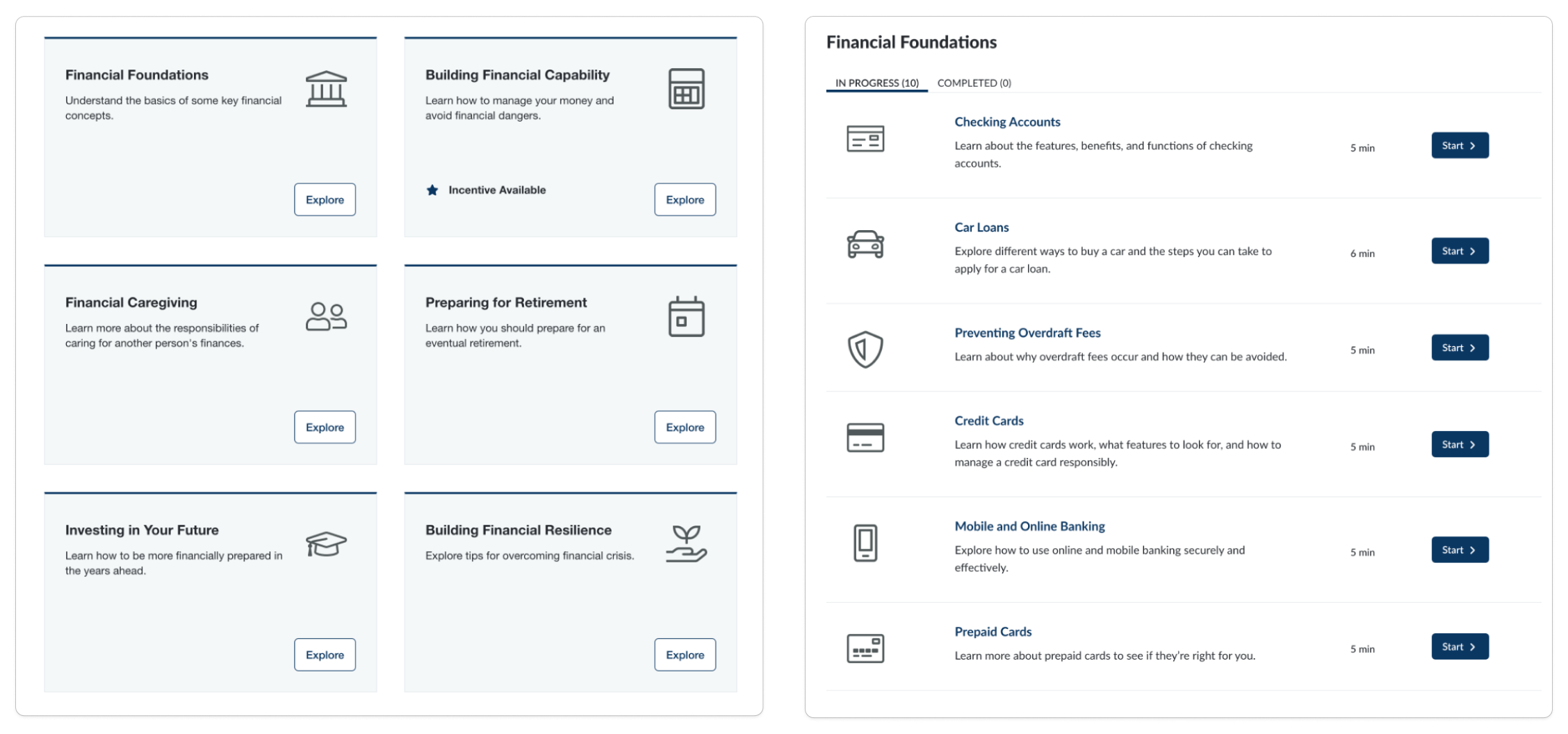 Modules within these larger content groups are often mixed in topic area. For example, “checking accounts” “car loans” and “preventing overdraft fees”