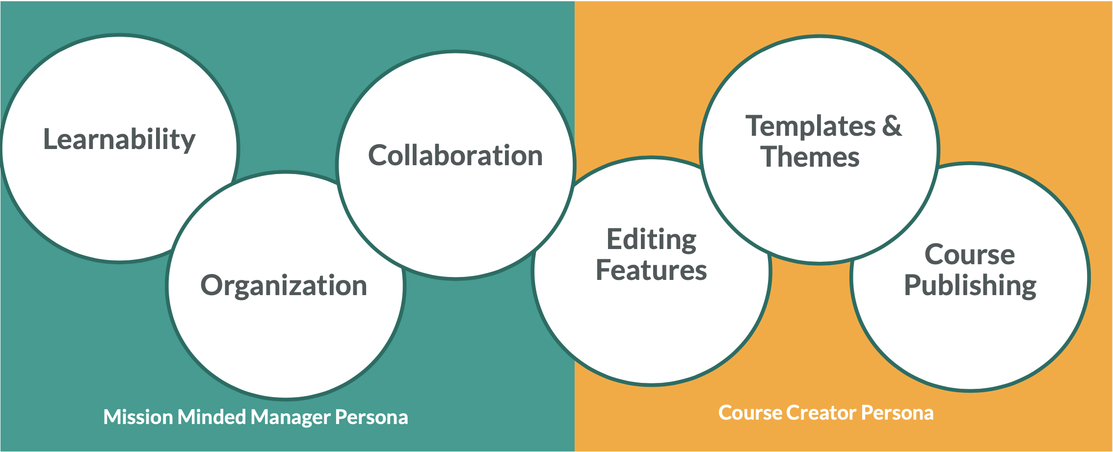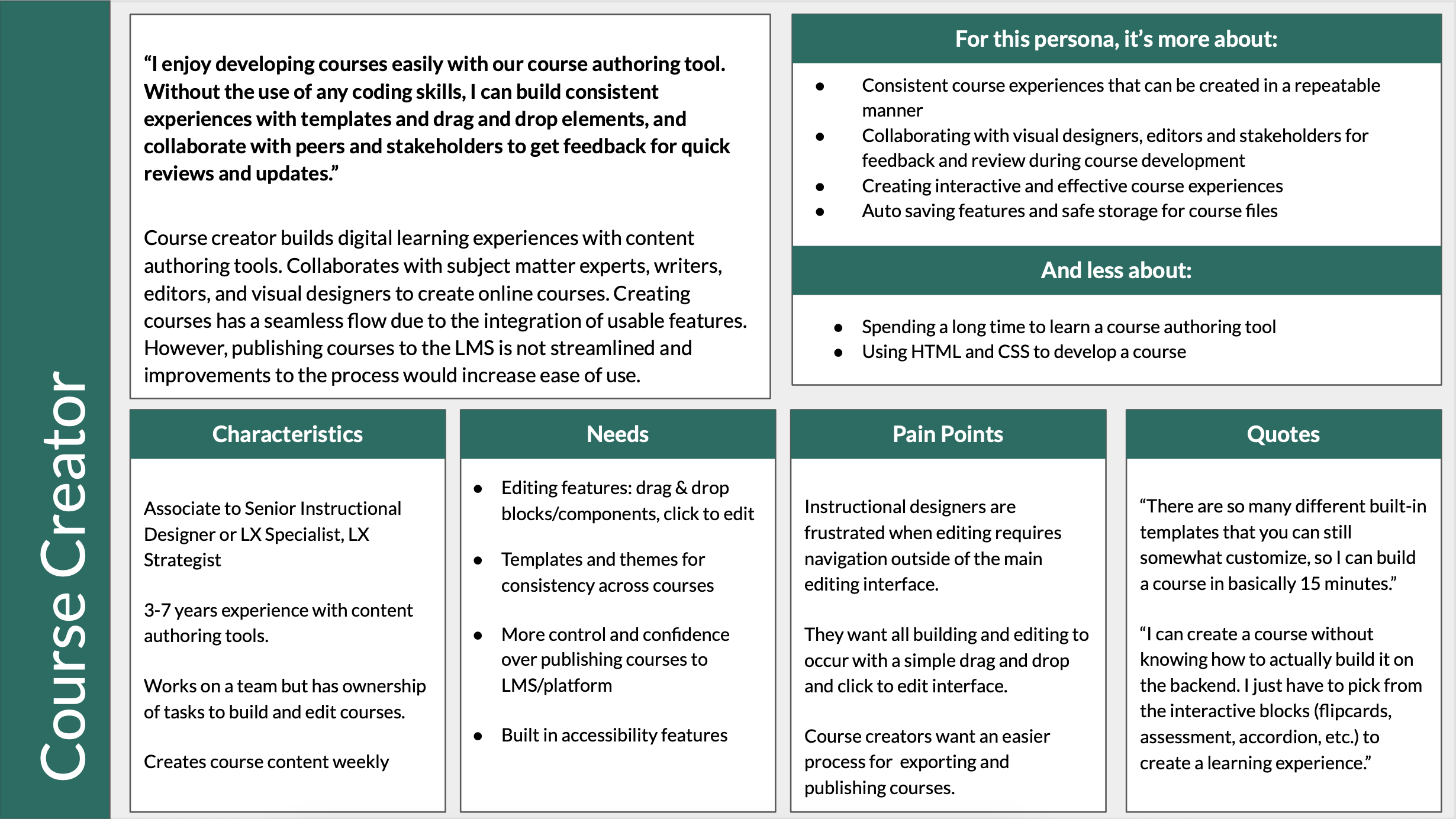 This persona uses content authoring tools to create courses. Course creators emphasized their need of: